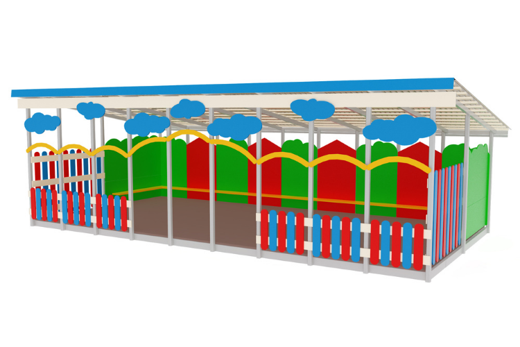 Несущая конструкция навеса - стальные опоры из профильных труб 80х80мм (24 шт), заделываемые в бетонный фундамент на глубину 500 мм, полы из ламинированной фанеры с антискользящим покрытием (толщиной 115 мм) по лагам подняты на 150 мм от планировочной отметки земли. Крыша имеет односкатную конструкцию, покрытие из стального профилированного настила по деревянным стропилам из доски 150*50 и обрешетке из доски 25*100. Имеется декоративный карниз из фанеры толщиной 15 мм, борта выполнены из фанеры толщиной 18 мм: на переднем фасаде навеса ограждение в виде разноцветного забора высотой 700 мм ,на заднем фасаде ограждение высотой от 900 мм до 1200 мм из фанерных щитов в виде домиков и деревьев. На фасадной части расположен дополнительный карниз – облачка, и декоративные арки. Под навесом имеются скамьи (вдоль заднего фасада и до середины торцевого).Параметры: